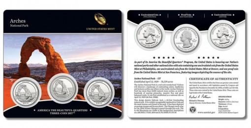 This newest America the Beautiful Quarter Three-Coin Set is the third issued this year and the 23rd in the series. Coins of the set honor the national park in Utah. Arches quarters entered circulation on June 9, 2014 with the official launch ceremony held three days earlier.