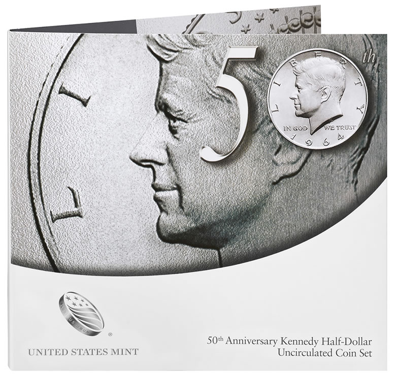 Special packaging has been produced for the set that includes a folder housing a coin card. An enlarged partial image of the obverse of the Kennedy half-dollar is shown on the front of the folder along with a number ‘5’ and a smaller image of the 1964 coin representing a ‘0’. Together, the number and the small coin create a ’50’ indicative of the 50th anniversary of the Kennedy half. "50th Anniversary Kennedy Half-Dollar Uncirculated Coin Set" is printed below the imagery along with the United States Mint logo.