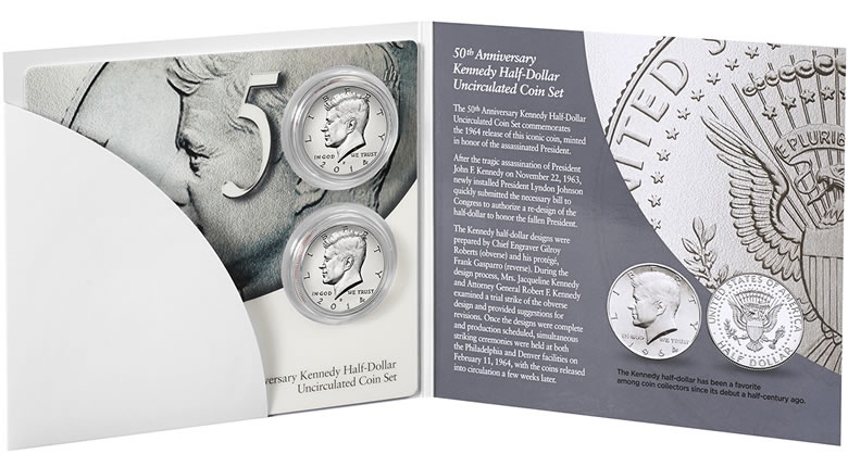 The 50th Anniversary Kennedy Half-Dollar Uncirculated Coin Set will be sold for $9.95, plus the U.S. Mint’s standard shipping and handling charge of $4.95 per order. Here is a link to the set’s product page within usmint.gov/catalog.
