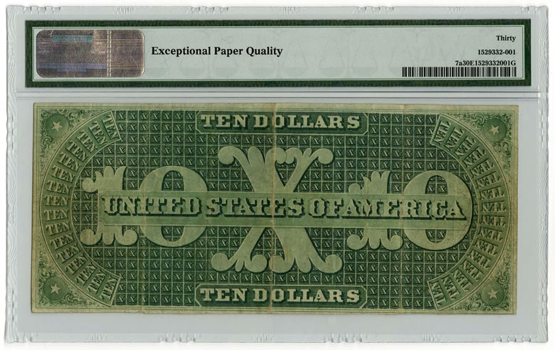 "The high quality signatures bring nice detail to the ‘for the’ inscriptions that still look impeccable over 150 years later," describes PMG. "As one of the first $10 ‘Greenbacks’ issued by the United States in 1861 to fund the Union’s campaign during the Civil War, its significance in American history nearly goes unmatched among US currency."