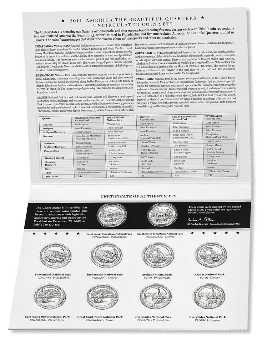 As in past years, this year’s America the Beautiful Quarters Uncirculated Set has five coins from the Denver Mint and five coins from the Philadelphia Mint. The quarters this year honor the following national parks: