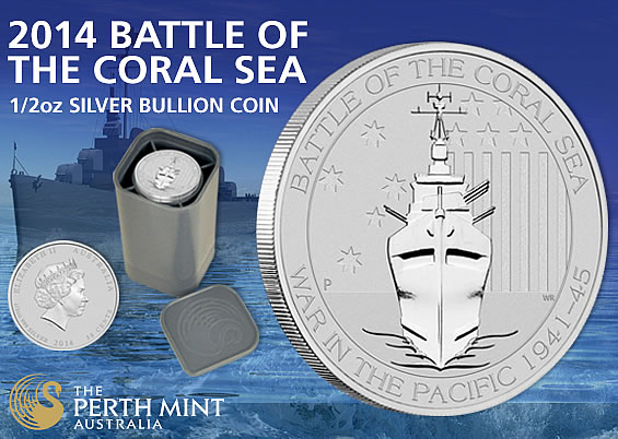New this month from the Perth Mint of Australia is its 2014 Battle of the Coral Sea Silver Bullion Coin with each composed from one-half ounce of 99.9% pure silver.