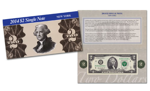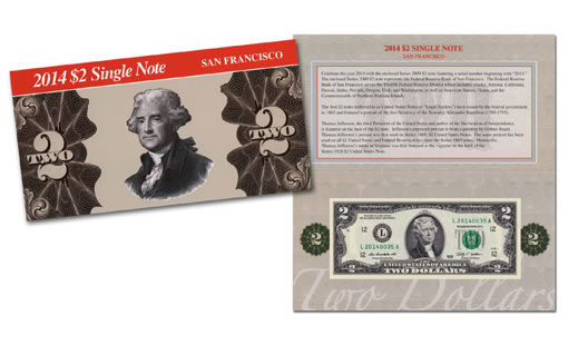 Notes of the 2014 $2 Single Note Collection as well as those ordered individually feature serial numbers beginning with the year "2014." The two notes within the collection will not have matching serial numbers, unlike the BEP’s recently issued and already sold out America’s Founding Fathers 2014 Currency Set.