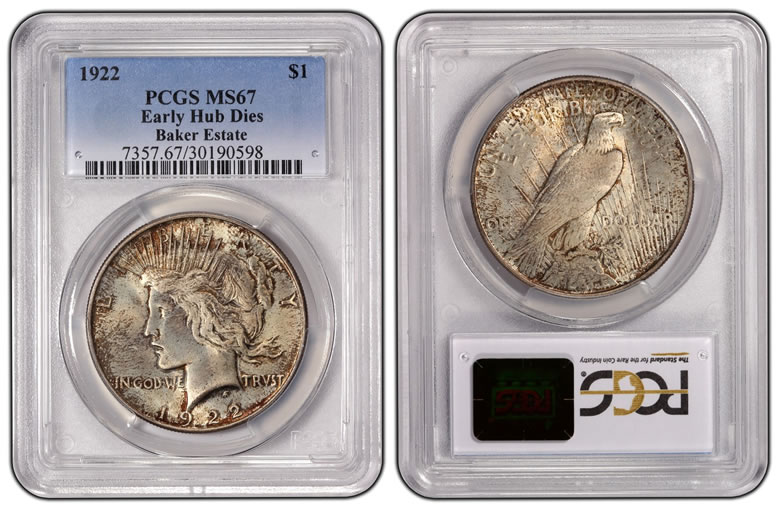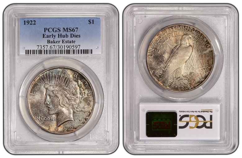 Another 1922 Low Relief, Early Hub Dies Peace dollar from the Baker Estate, also graded PCGS MS67. -