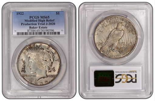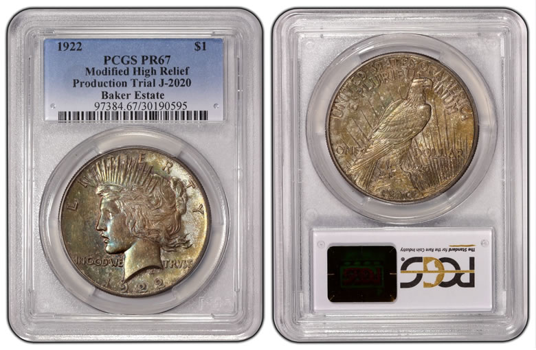 From the Baker Estate and graded PCGS PR67, this is one of the few surviving trial examples (J-2020) of 1922 Peace dollars with a Modified High Relief and a Satin finish. -
