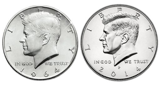 An obverse portrait of President John F. Kennedy is featured on both halves just it first appeared on inaugural 1964 coins. The effigy, by United States Mint Sculptor-Engraver Gilroy Roberts, has seen a several revisions over the years. When comparing the original design on the 1964 and 2014 50th anniversary halves to the one appearing on other modern Kennedy halves, like those found within the rolls and bags releases earlier this year, there are distinct differences in the hair, chin and cheek details.
