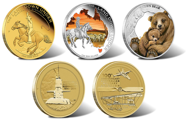 They include coins emblematic of an Australian Stockman, a Mother’s Love showcasing a brown bear and her cub, and a stamp and two-coin cover set honoring the centennials of Australian military aviation and the Australian submarine program. Also, there are new ANZAC Spirit coins.