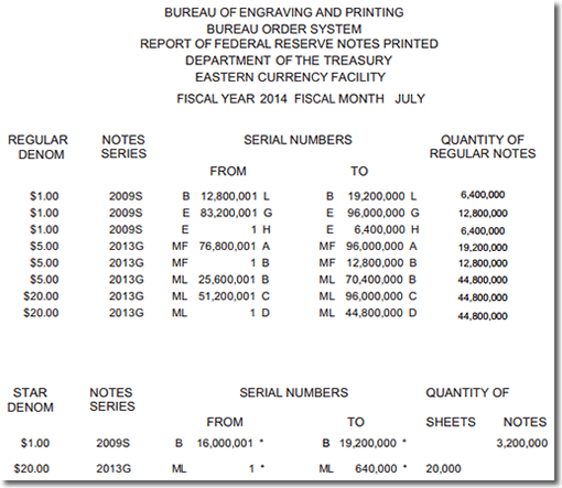 The BEP last month produced star notes in denominations of $1s, $20s and $50s. These are indicated by the "*" designator in the money production charts above. Star notes are replacements for misprinted notes or certain serial numbers, like 000 000 000. Money collectors find them desirable since they are rarer, making them more difficult to find.