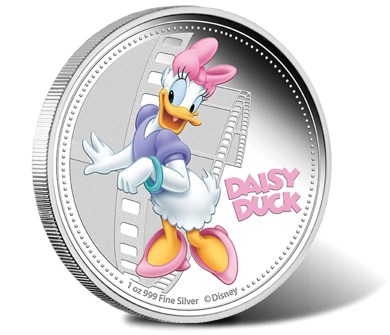 2014 Daisy Duck 1 Oz Silver Proof Coins show Daisy Duck wearing her trademark blouse with puffed short sleeves, a matching hair bow, and heeled shoes.