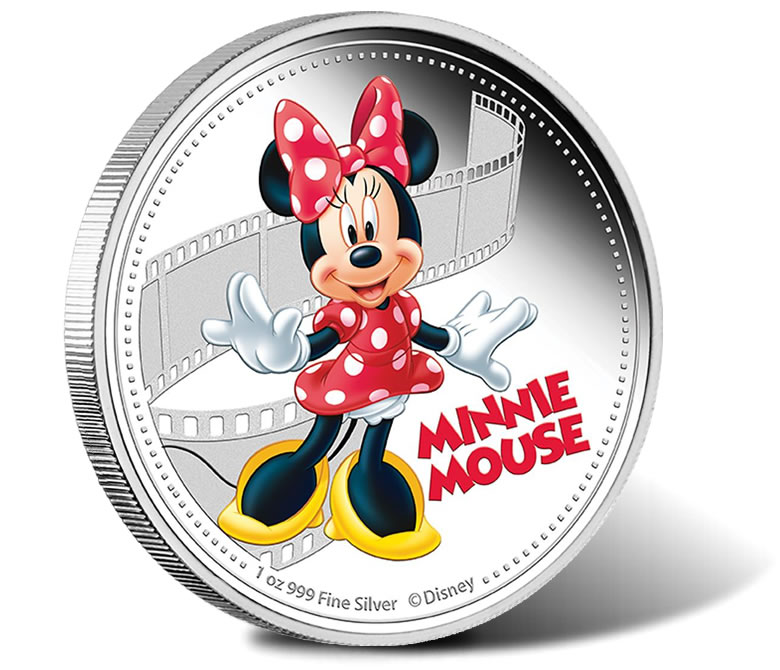 Minnie Mouse 1 Oz Silver Proof Coins show Minnie Mouse in her trademark red and white polka dot dress.