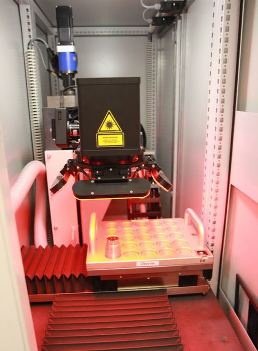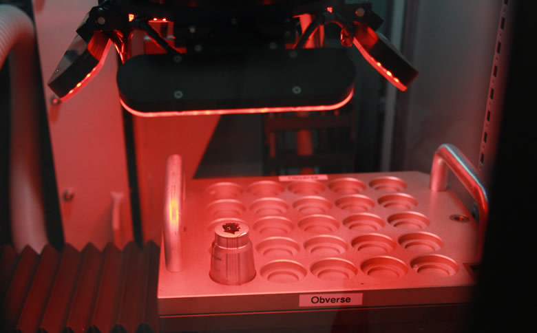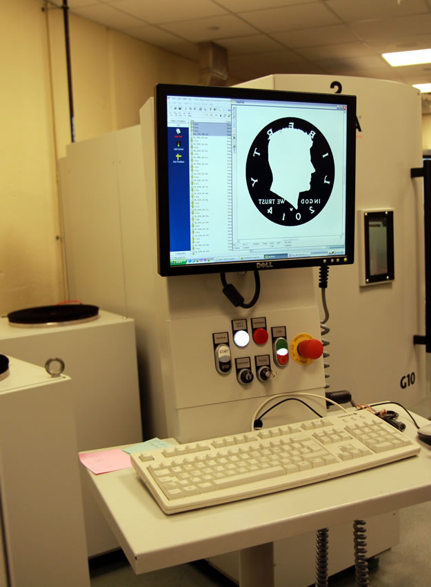 These next three photos show the workings of the FOBA® Laser Marking & Engraving machine. The software-controlled laser hits dies at varying intensities to apply laser-frosting treatments. On this occasion, it was treating dies for 2014-W Reverse Proof Kennedy Half-Dollars — one of the four silver coins to launch this fall in the 2014 50th Anniversary Kennedy Half-Dollar Silver Coin Collection.