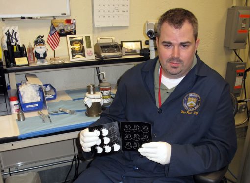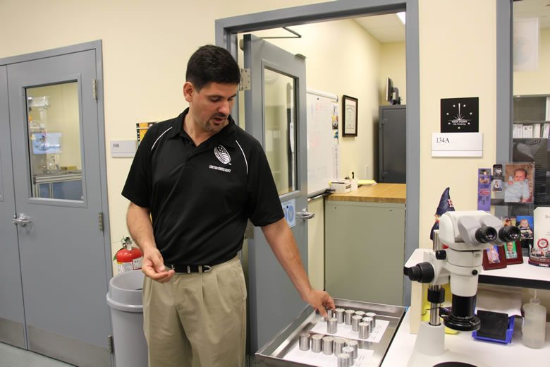 Here, Dennis Flaherty, Die Finishing Specialist, shows laser tape that was created in-house to protect artwork for the die finishing process of 2014-W Proof Platinum Eagles.