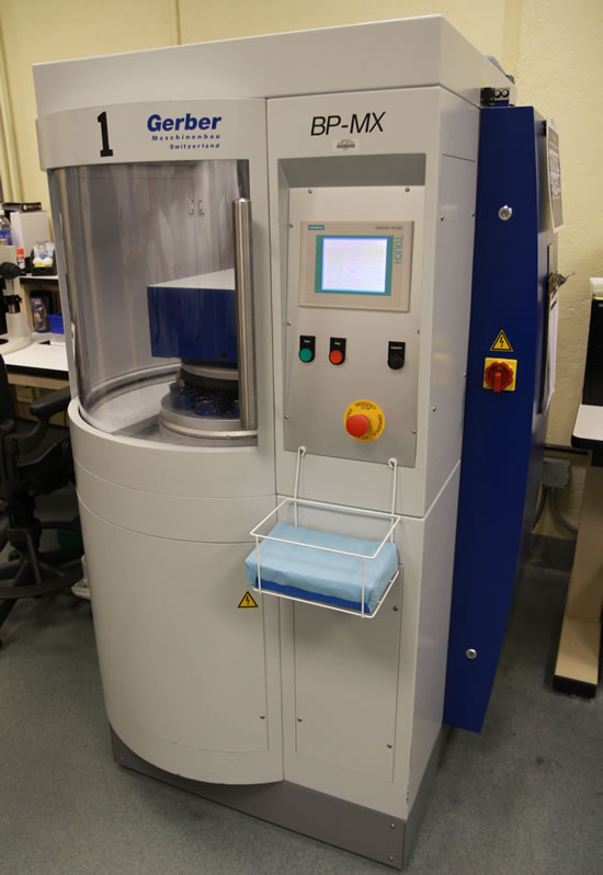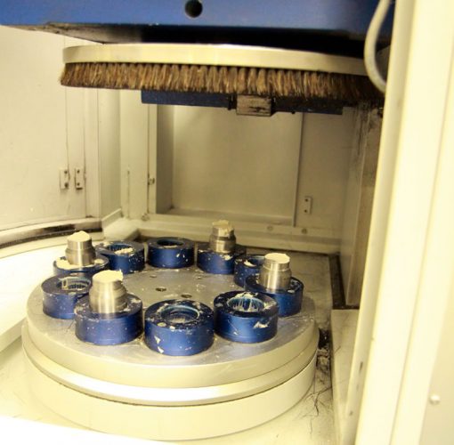 Next, here is one of the West Point Mint’s automated polishing machines. It’s fitted with a brush pad. When the machine runs, the brushes make contact with surfaces of dies until the desire polishing results are achieved. Dies are then transferred to another machine with a felt pad to produce finer results.