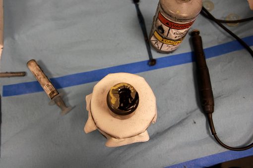 In the upcoming photo, the tape is shown adhered to the die and protecting the design, making it easier to polish the field. A rotary tool is used for that. An article about our trip to the Philadelphia Mint covers these polishing methods in detail.