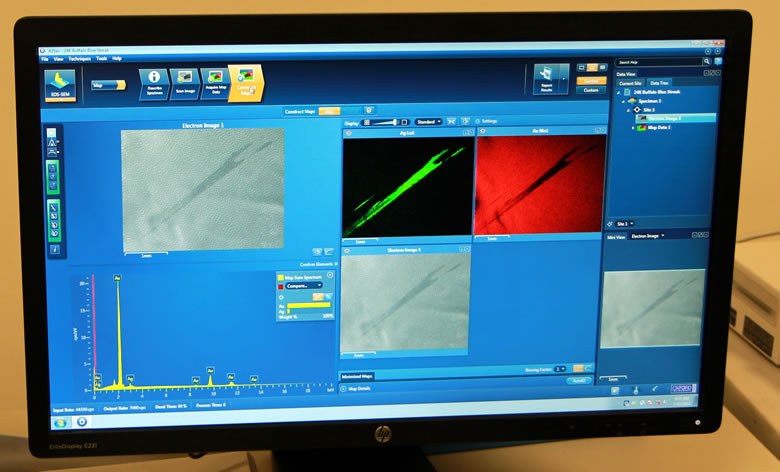 Scanning electron microscopes (SEMs) find impurities in coin planchets. These next two photos are of a SEM and its image output showing trace contamination that was rolled into a gold planchet at the time of its manufacturing.