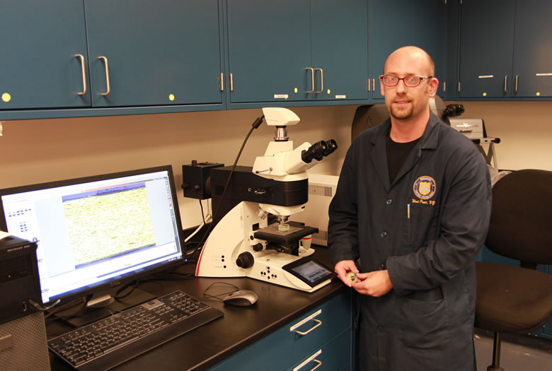 Testing becomes more involved going forward. Queue in heavier equipment, and one of the Mint’s best and brightest — Dr. Chris Cowen, plant metallurgist. During our visit, Chris was examining the microstructure of a 0.9999 fine gold Kennedy half-dollar planchet.