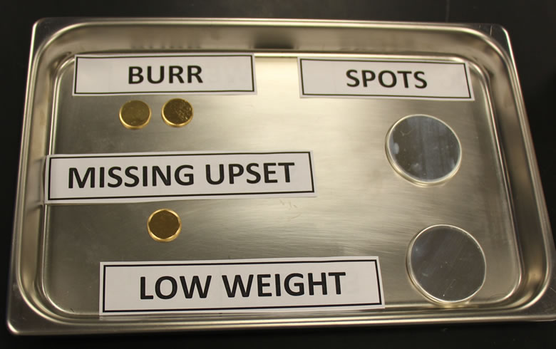 Before planchets make it to the coining press floor, West Point Mint assayers test random samples to assess whether contractors’ met their required specifications. The following photo sums up the quicker aspects of the job — studying a planchet’s visual attributes and testing its physical dimensions to include weight, diameter, and thickness. The planchets below failed.