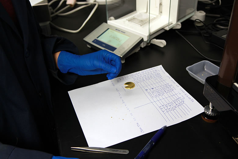 Weights of the metal are taken before and after the process. The next two photos show chemist Grace Cheong cutting a pie section from a gold planchet and weighing it. The cut section is eventually rolled flat and sampled for alloy composition by fire assay.