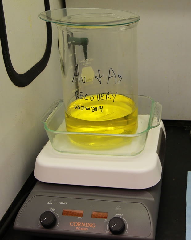 Precious metals are not wasted at the West Point Mint, regardless of their form. This beaker contains dissolved gold and silver that was recovered. It will eventually get reclaimed.