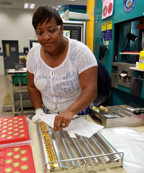 Below are some of the gold planchets made by Mint contractors. Their flattened, circular shape and raised rims hint at their purpose. Planchets become coins when struck in U.S. Mint coining presses. In this photo, coin manufacturer Regina Robinson is about to do just that.