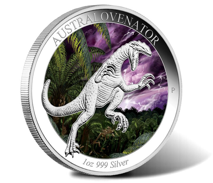 The 2014 Australovenator Silver Proof Coin marks the debut of a new five-coin series featuring Australian dinosaurs from the Cretaceous Period. This first coin offers a colored reverse depicting the Australovenator.