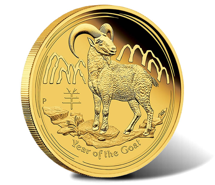 Depicting a single adult male goat, three 2015 Year of the Goat Gold Proof Coins are available in 1 ounce, a 1/4 ounce and 1/10 ounce sizes. These three 99.99% pure lunar gold coins are also sold as part of set.