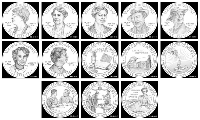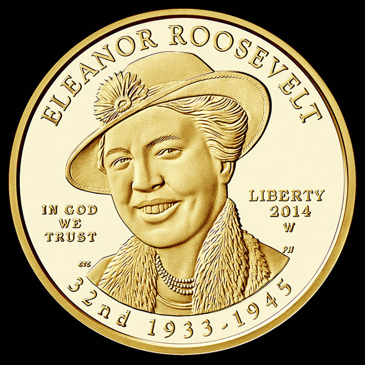 These coins are the fourth and final issues of 2014 from a series that honors spouses of United States Presidents. Featured on proof and uncirculated coins is Eleanor Roosevelt, the 32nd First Lady of the United States and wife of Franklin D. Roosevelt.