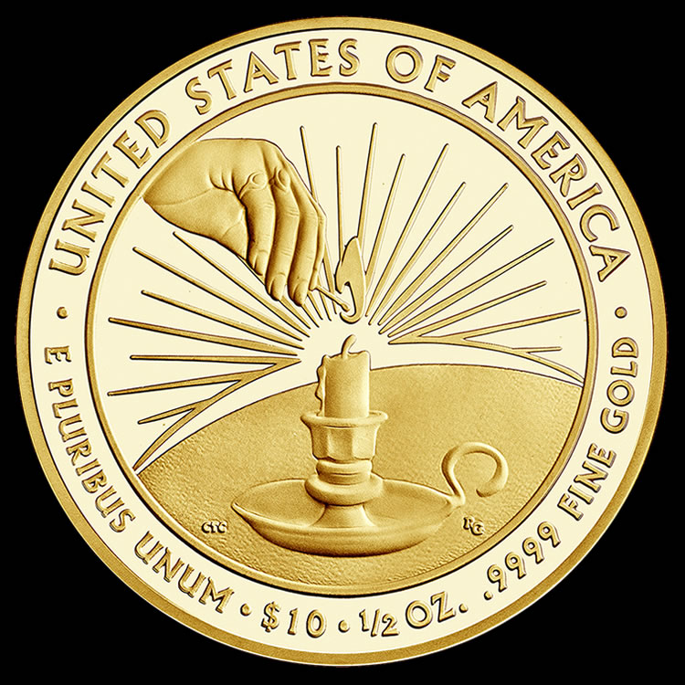 Reverses feature Mrs. Roosevelt’s right hand lighting a candle, symbolic of her life’s work and the global impact of her humanitarian initiatives. Inscribed around the image are UNITED STATES OF AMERICA, E PLURUBUS UNUM, $10, ½ OZ, and .9999 FINE GOLD. The reverse was also designed by Chris Costello. It was sculpted by U.S. Mint Sculptor-Engraver Renata Gordon.