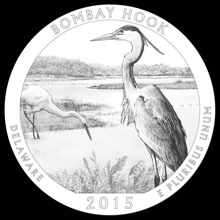 For Bombay Hook National Wildlife Refuge quarters and five ounce silver coins, a great blue heron is shown in the foreground and a great egret appears in the background. They populate the refuge’s tidal salt marsh. Inscriptions encircle the design with BOMBAY HOOK, DELAWARE, 2015, and E PLURIBUS UNUM.
