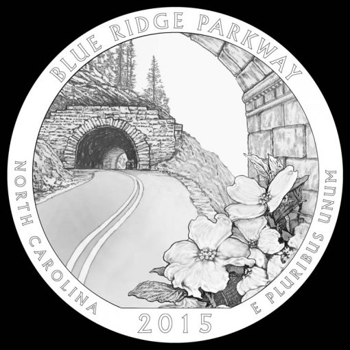Blue Ridge Parkway coins display a curved road hugging the side of a mountain as it enters a tunnel. The North Carolina state flower populates the foreground. Around the design are inscriptions of BLUE RIDGE PARKWAY, NORTH CAROLINA, 2015, and E PLURIBUS UNUM.