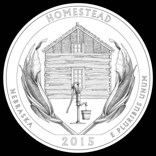 On the reverse of the Homestead National Monument quarter and five ounce silver coins, the corn stalks, log home, and outdoor water pump represent three survival fundamentals common to homesteaders: food, shelter, and water. Inscriptions around the design are HOMESTEAD, NEBRASKA, 2015, and E PLURIBUS UNUM.
