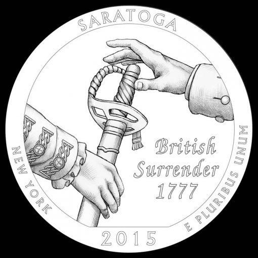 Saratoga National Historical Park coins offer a close-up of the moment British General John Burgoyne surrendered his sword to American General Horatio Gates, representing a pivotal moment in the American Revolutionary War. Outside inscriptions include SARATOGA, NEW YORK, 2015, and E PLURIBUS UNUM. Next to the sword are inscriptions BRITISH SURRENDER 1777.