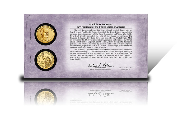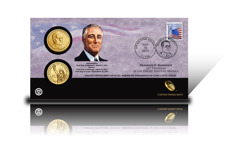 This is the 32nd release from the Mint’s America Presidency $1 Coin Cover Series and honors the 32nd President of the United States, Franklin D. Roosevelt.