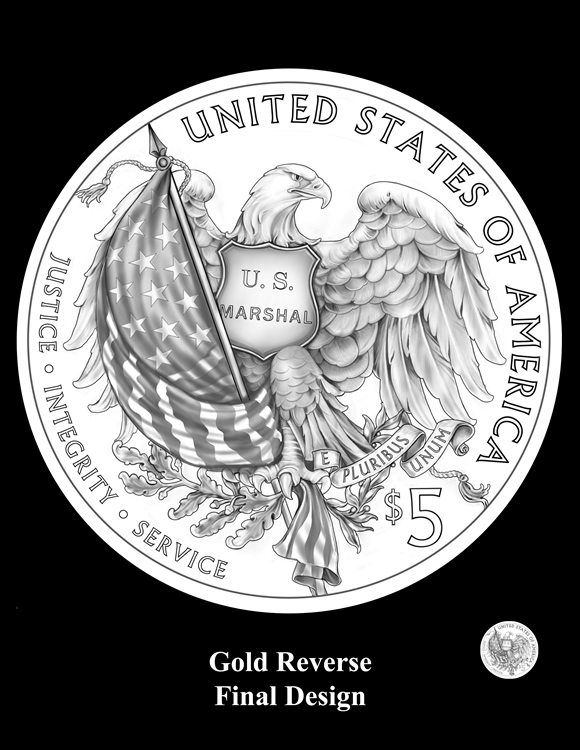 Obverses of the upcoming $5 gold coin, which memorializes fallen U.S. Marshals Service operational personnel, will feature the current badge of a U.S. Marshal and an inscription across the bottom reading 225 YEARS OF SACRIFICE.