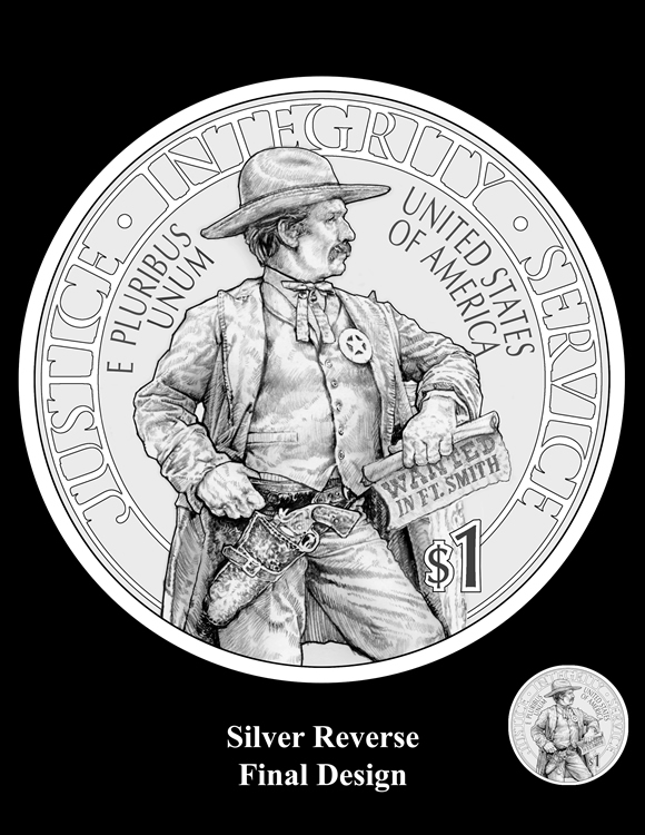 The coin act instructs the $1 silver coin to honor the agency’s legendary status in history. For the obverse, a historic badge is the focal point. Beneath it are several deputy U.S. Marshals on horseback.