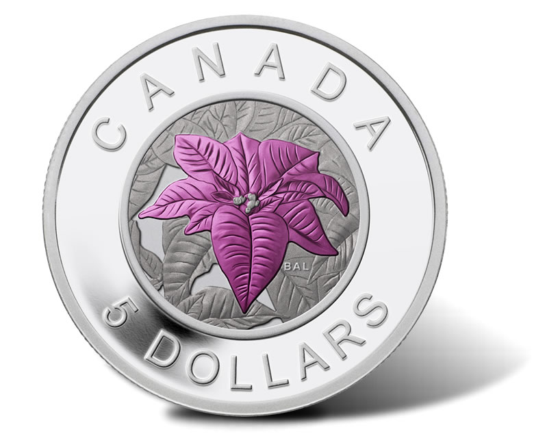 On the coin’s reverse is the distinctive color of the poinsettia flower contrasted against leaves of the plant. Inscribed around the design is CANADA and 5 DOLLARS. Designer Bert Liverance’s initials of BAL are also found to the lower right of the flower.