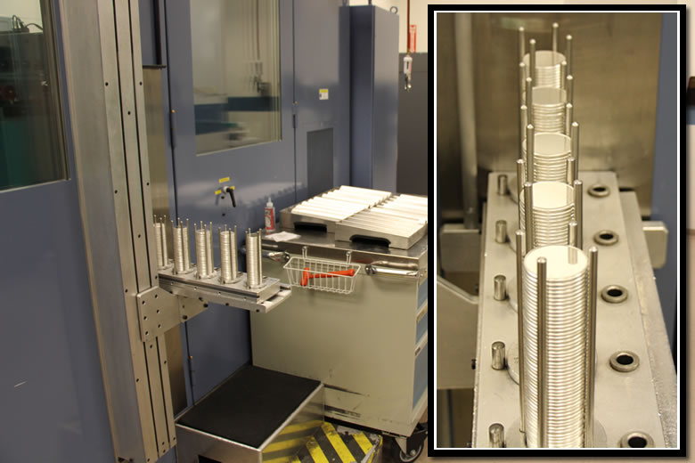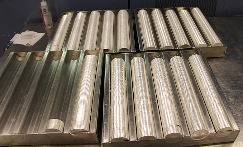 Once okayed for production, the blanks are stacked into cassettes and fed into coining presses like shown below.