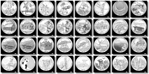 These quarters and coins mark the 7th year in their related series and the 31st through 35th releases. Designs are emblematic of the following five sites of national interest: