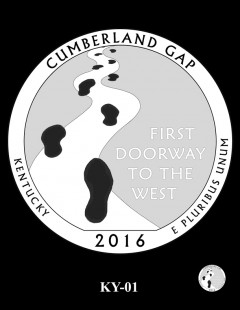 Design 1 (KY-01) features a series of footprints symbolizing the journey through Cumberland Gap, the "first great gateway to the west." Cumberland Gap was first used by animals, then by Native Americans, frontiersmen, and eventually hundreds of pioneers as a gateway through the Cumberland Mountains. The additional inscription reads First Doorway to the West.