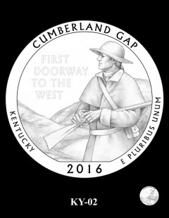 Design 2 (KY-02) features a frontiersman gazing across the mountains to the West. Many pioneers used Cumberland Gap on their journey into the western frontiers of Kentucky and Tennessee. The additional inscription reads First Doorway to the West.