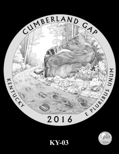 Design 3 (KY-03) features Indian Rock, a large isolated boulder that became a landmark many animals and humans have passed by as they traveled through Cumberland Gap. It is reputed to be a spot from which people were ambushed; it bears scratches and messages from settlers passing through; it has been a waylaying station and a grave marker; and it also served as a billboard along the Dixie Highway, which historically led travelers through the Gap.