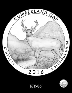 Design 6 (KY-06) depicts a white-tailed deer with the Cumberland Gap in the background.