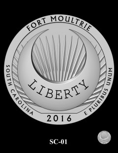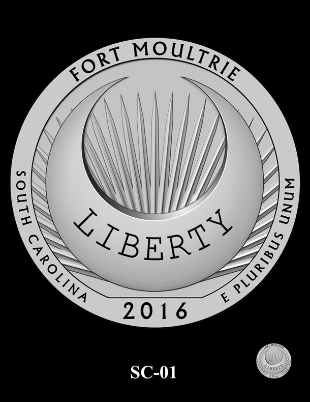 Design 1 (SC-01) depicts the distinctive silver crescent worn by the 2nd South Carolina Regiment that garrisoned Fort Moultrie in its 1776 victory over the British. The silver crescent was inscribed with the word LIBERTY. It is set against a single palmetto frond, representing the use of the palmetto in the construction of the Fort.