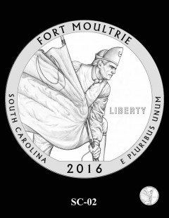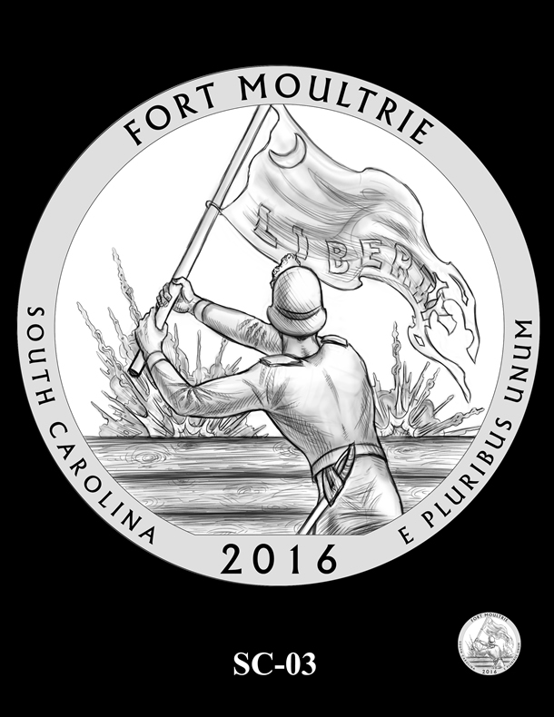 Design 3 (SC-03) depicts Sergeant Jasper as he waves the Regimental Flag as bombs from British ships explode in front of him.