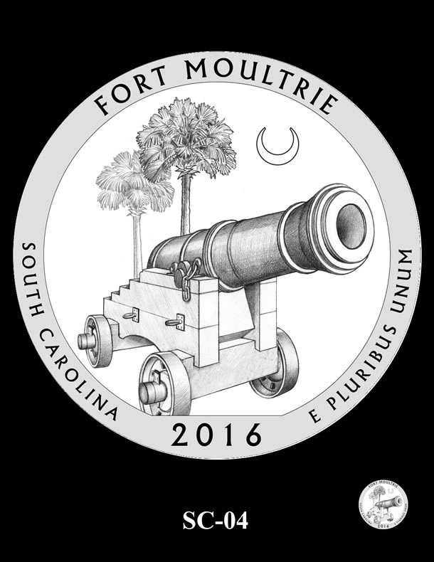 Design 4 (SC-04) shows a cannon from the Revolutionary War period as used at Fort Moultrie in 1776. The palmetto trees in the background are those used to build the fort. The open crescent in the sky is depicted as it was on the original 2nd Regimental Flag of 1776.
