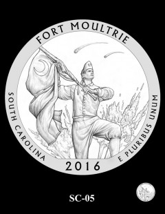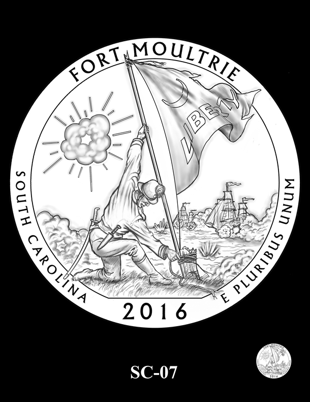 Design 7 (SC-07) shows Sergeant Jasper planting the Regimental Flag and holding it firm as the British ships continue to bomb the fort.