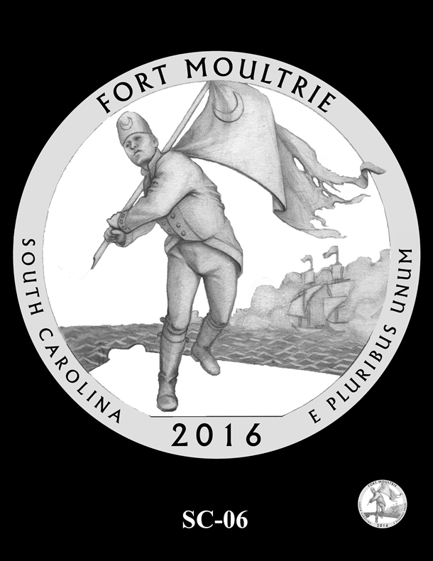 Design 6 (SC-06) depicts Sergeant Jasper as he recovers the Regimental Flag and returns it to the ramparts while a British ship continues its attack.