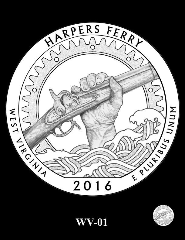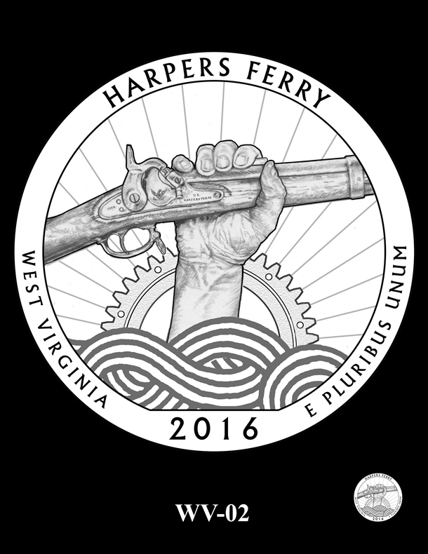 Design 1 (WV-01) features a hand clutching a rifle emerging from the stylized water with a gear in the background. Water was the source of power for the industrial revolution. As such, the location of Harpers Ferry, where the Shenandoah and Potomac rivers converged, was key to its development. The rivers were used to power the equipment at the United States Armory and Arsenal at Harpers Ferry.