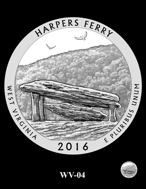 Design 3 (WV-03) depicts John Brown’s Fort, a building originally used as a fire engine and guard house for the armory at Harpers Ferry. During John Brown’s Raid, Brown, an abolitionist, took refuge in the building. The building was the only Armory building to escape destruction during the Civil War.