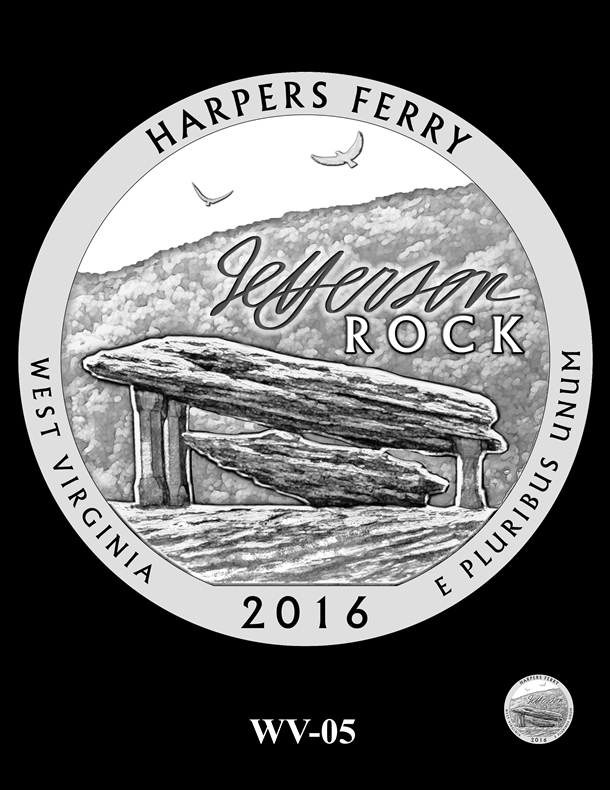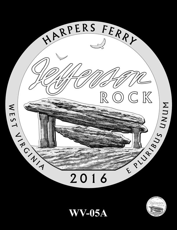 Design 5 (WV-05) also shows the hawks and Jefferson Rock but includes a replica of Thomas Jefferson’s signature.